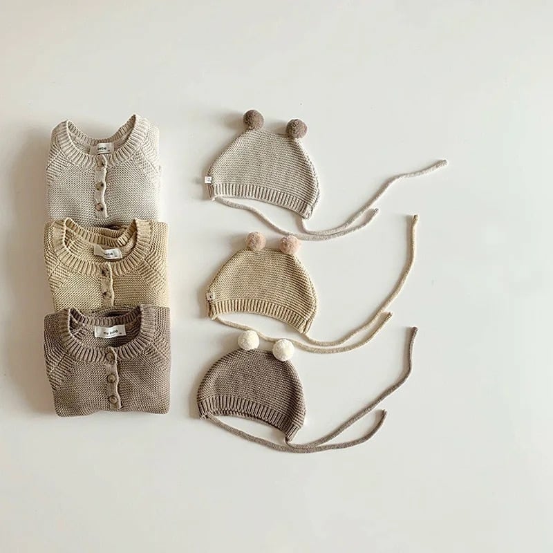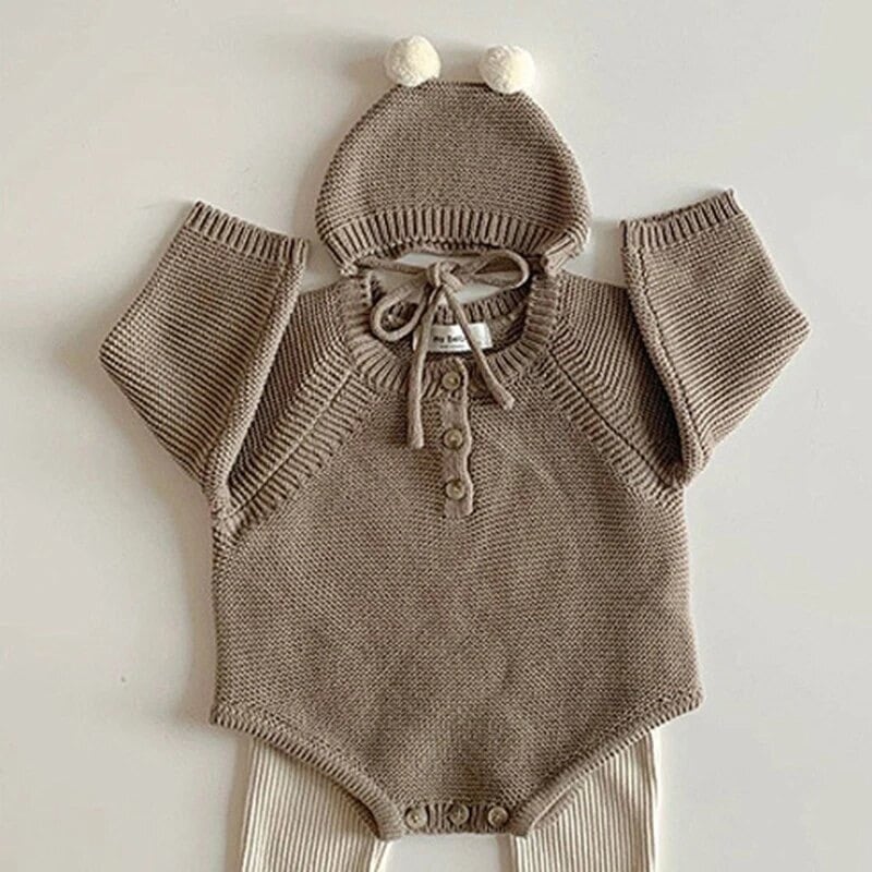 コットン素材のかわいい帽子付きのニットロンパースです♡